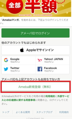 いずれもお持ちでない方は「Ameba新規登録(無料)」をタップします ↓